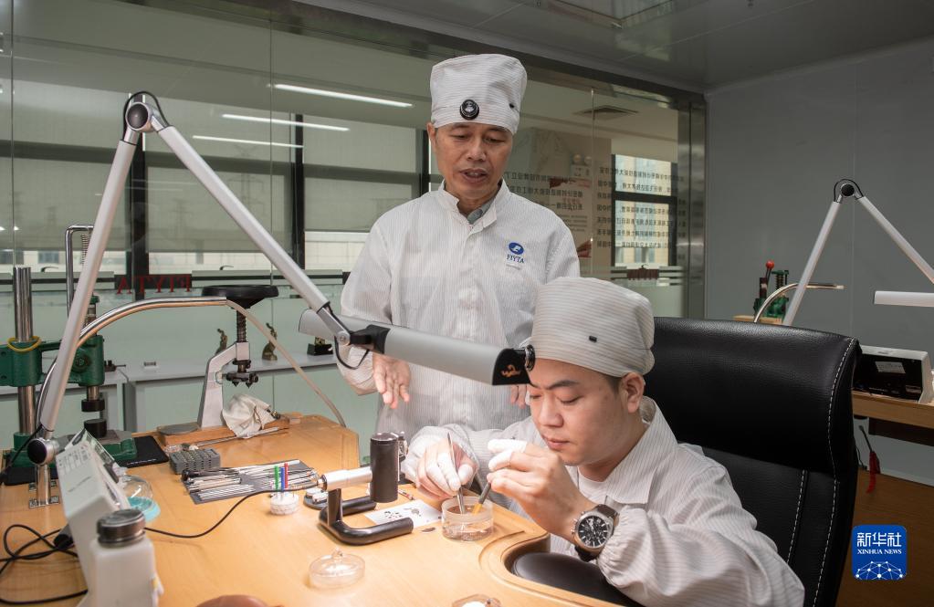 4月25日,在位于深圳的飞亚达钟表大厦,刘中华指导徒弟进行手表拆卸和清洗。新华社记者 毛思倩 摄