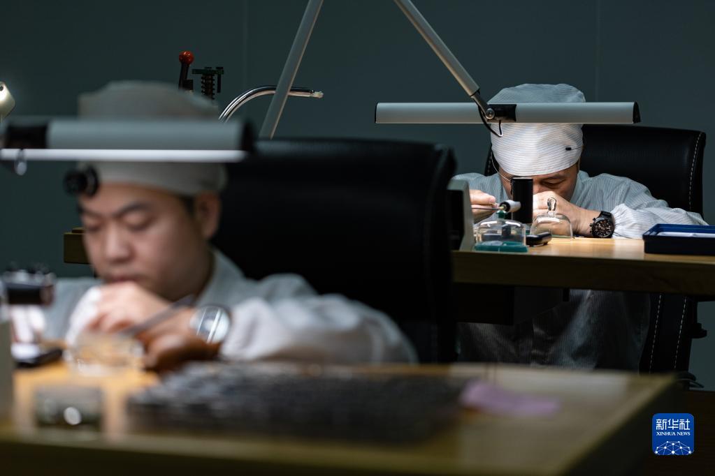 4月25日,在位于深圳的飞亚达钟表大厦,刘中华装配手表(右)。新华社记者 毛思倩 摄