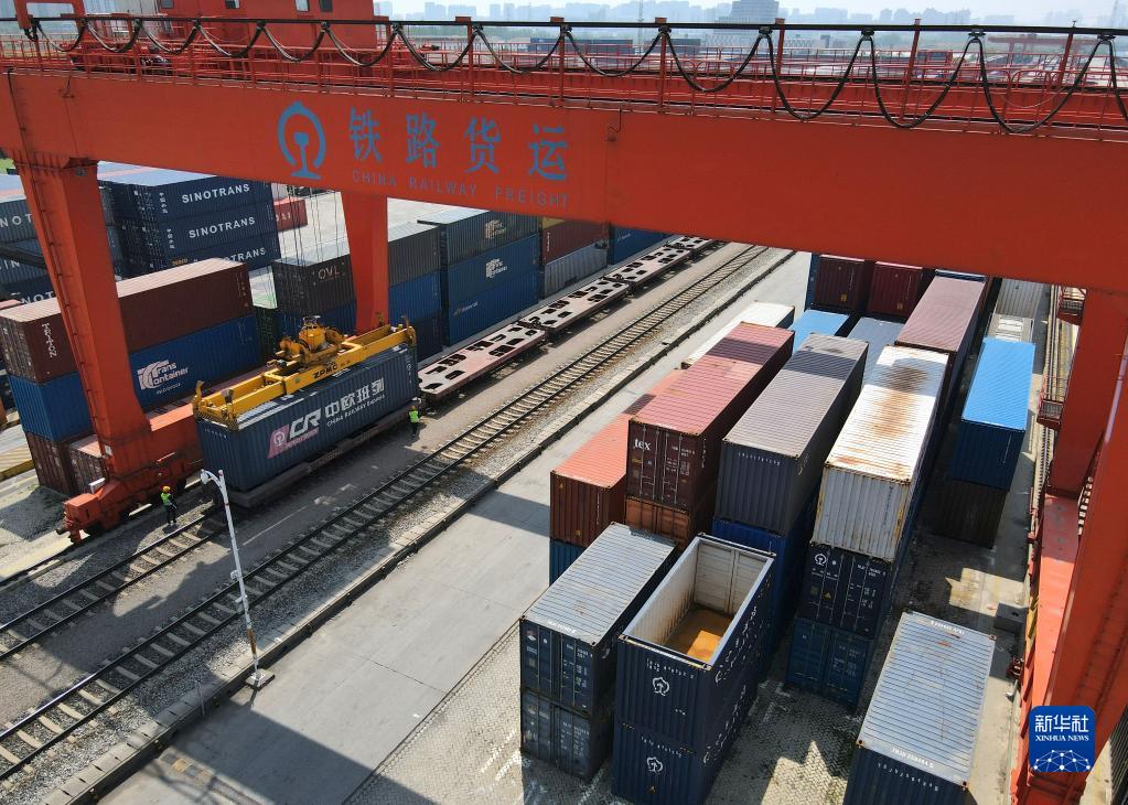 在铁路合肥货运中心合肥北站物流基地,吊车司机将中欧班列集装箱吊运到列车上(4月27日,无人机照片)。