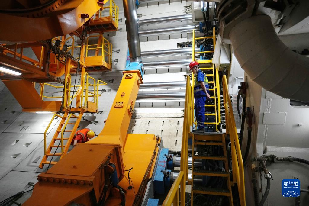在盾构机推进一环结束后的管片拼装期间,黄鲁(右)在旁站管片拼装(4月19日摄)。