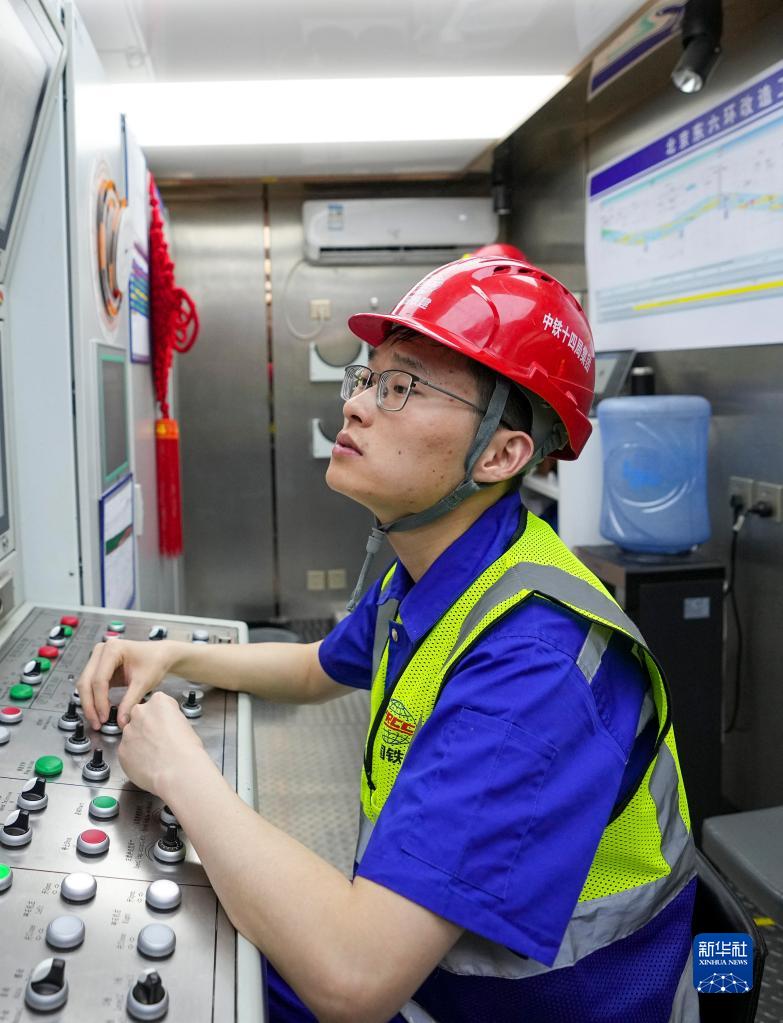 在北京东六环入地改造工程的西线隧道内,黄鲁在控制室内操作京华号盾构机(4月19日摄)。