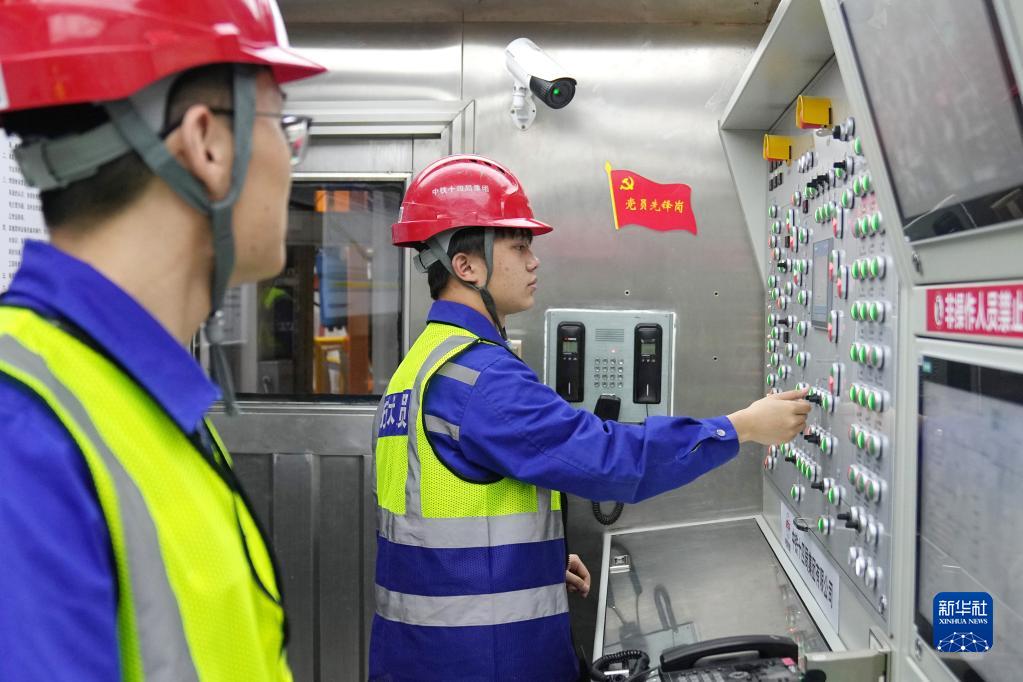在北京东六环入地改造工程的西线隧道内,黄鲁(左)在控制室内看着“00后”机长助理杨雪龙操作京华号盾构机(4月19日摄)。