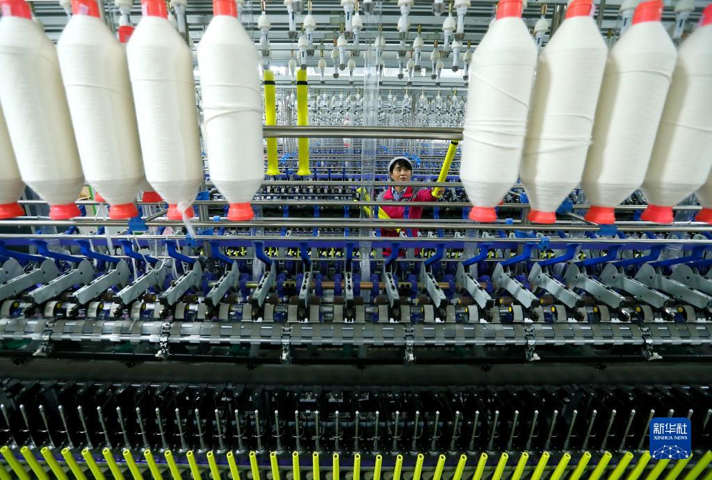4月29日,技术工人在山东省青岛市即墨区即发龙山工业园的一处数字化智能纺纱工厂调试生产设备。