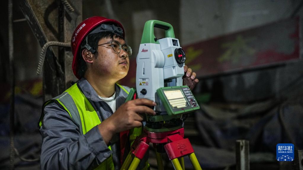 4月29日,技术人员在贵阳地铁S1线一期工程锦江路站观测沉降情况。