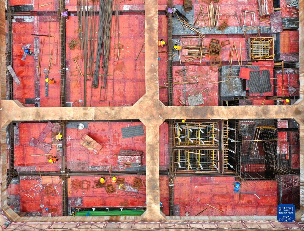 4月29日,工人在广西南宁市良庆区中建三局一公司南宁中银金融中心项目建设工地忙碌(无人机照片)。