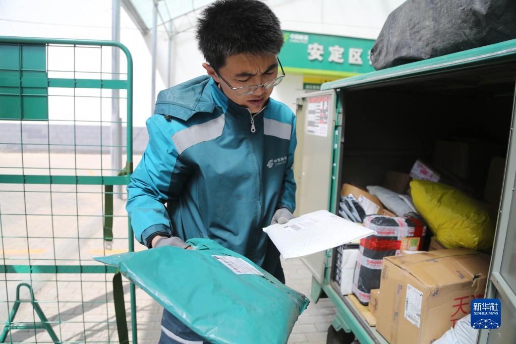 4月29日,在甘肃省定西市,一名邮递员在装运快件。