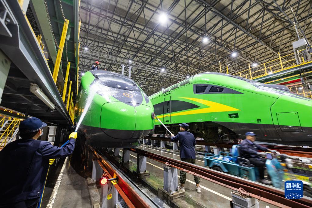 4月29日凌晨,在西安东客车整备所,工作人员在清洁列车。