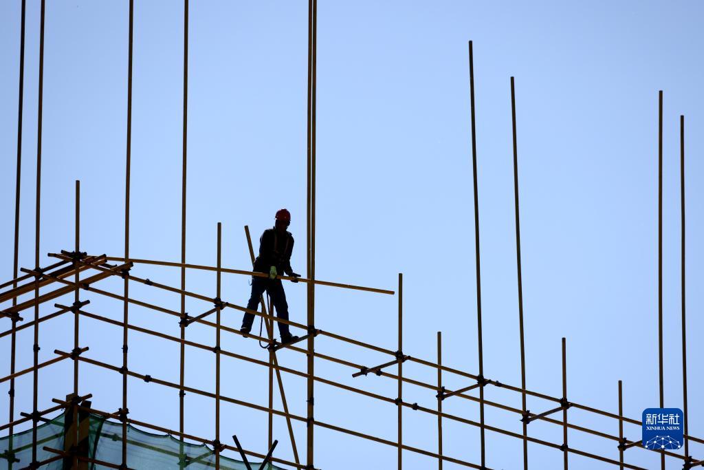 4月29日,建筑工人在山东省枣庄市一处建设工地施工。