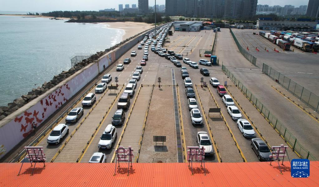 4月29日,车辆在海口新海港排队等待登船(无人机照片)。