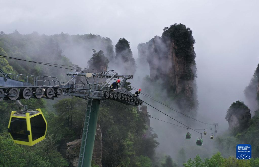 4月24日,张家界国家森林公园杨家界索道检修工在巡检设备,排除安全隐患,保障游客游览安全(无人机照片)。