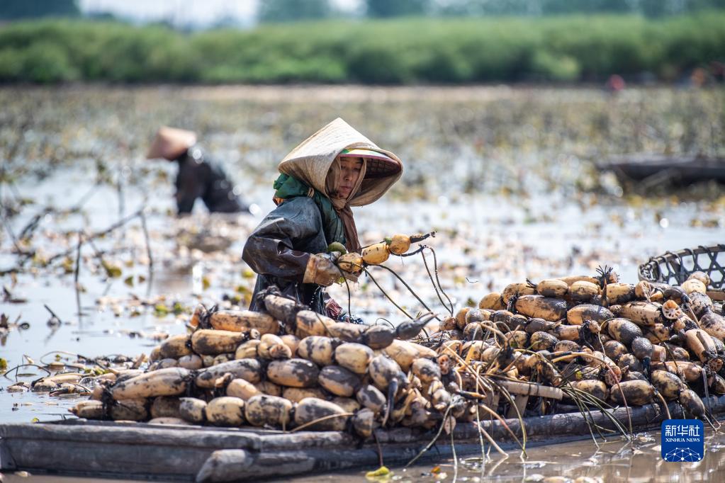4月26日,藕农在湖南省益阳市南县中鱼口镇菱角湖村的荷塘中采挖莲藕。