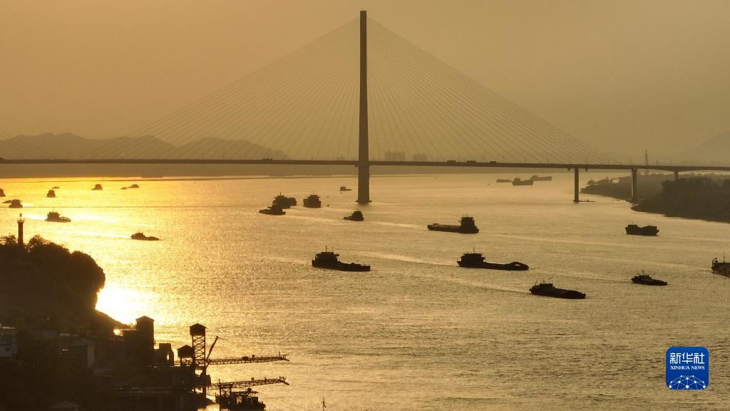 4月26日傍晚,在长江江西九江瑞昌段的航道上,往来船只与夕阳组成了一幅壮美画面(无人机照片)。