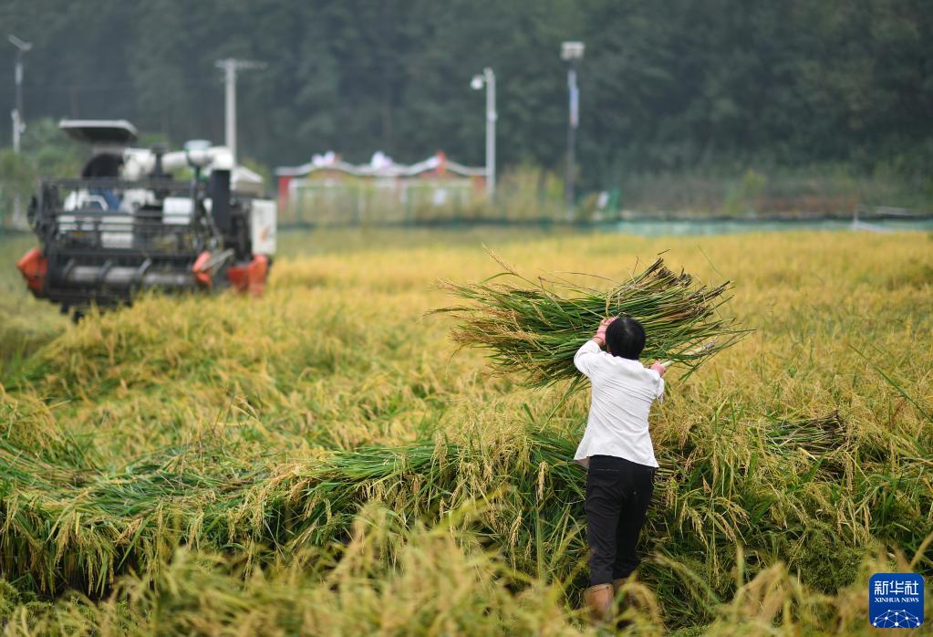 在陕西省汉中市洋县龙亭镇一处稻渔综合种养基地,农民在收割水稻(2022年9月15日摄)。