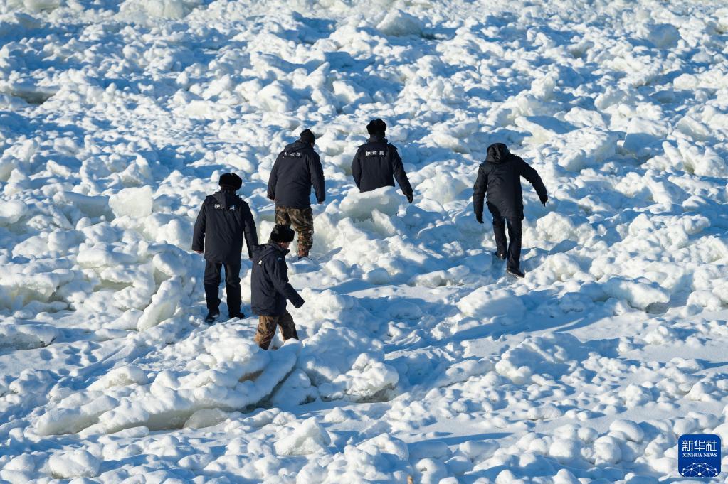 在位于“中国北极”黑龙江省漠河市的洛古河村,护边员在封冻的黑龙江上巡逻(2021年1月9日摄)。