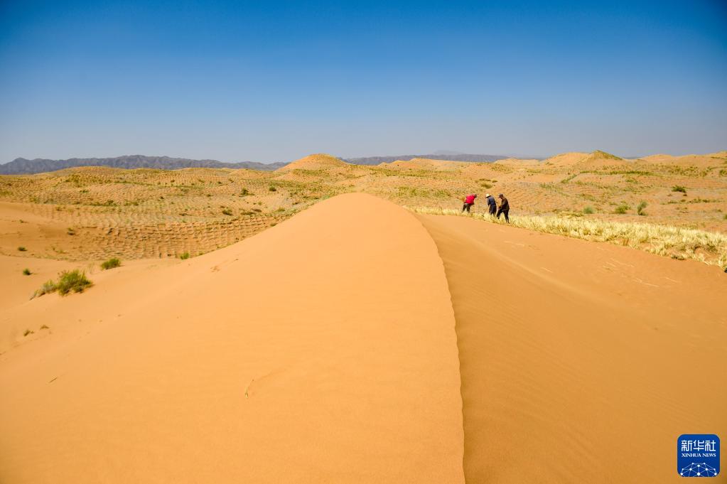 治沙工人在宁夏中卫市长流水沙区扎制草方格(2019年6月13日摄)。