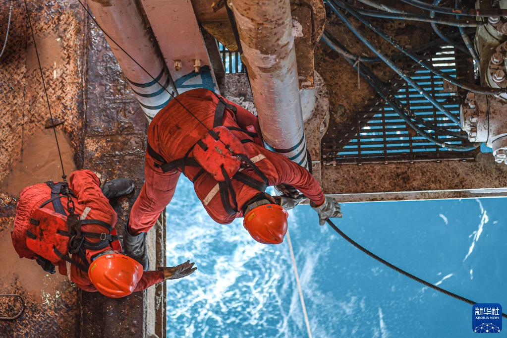 工人在位于南海北部海域的勘探三号钻井平台上作业(2020年7月27日摄)。