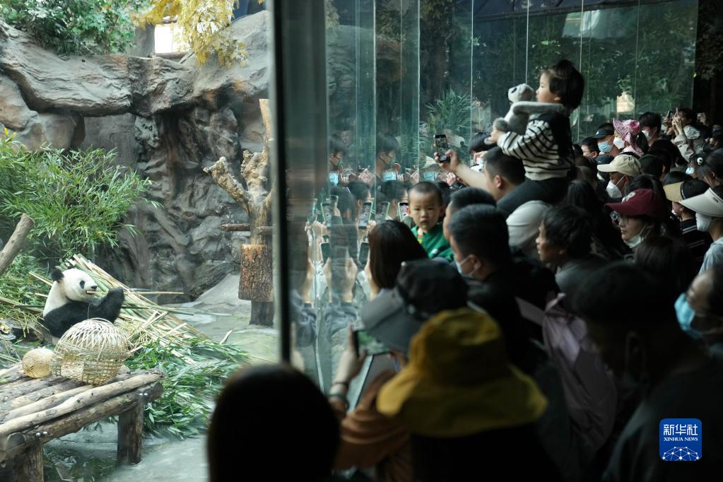 4月30日,游客在北京动物园大熊猫馆观赏大熊猫。