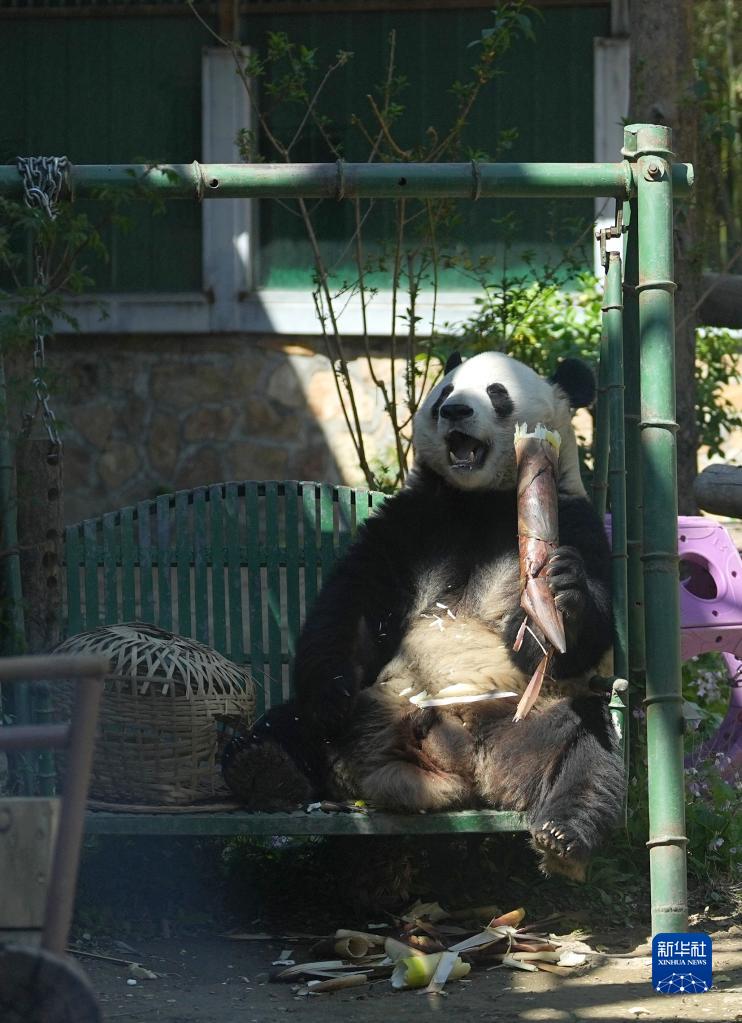 4月30日,在北京动物园大熊猫馆,大熊猫“萌兰”在吃竹笋。