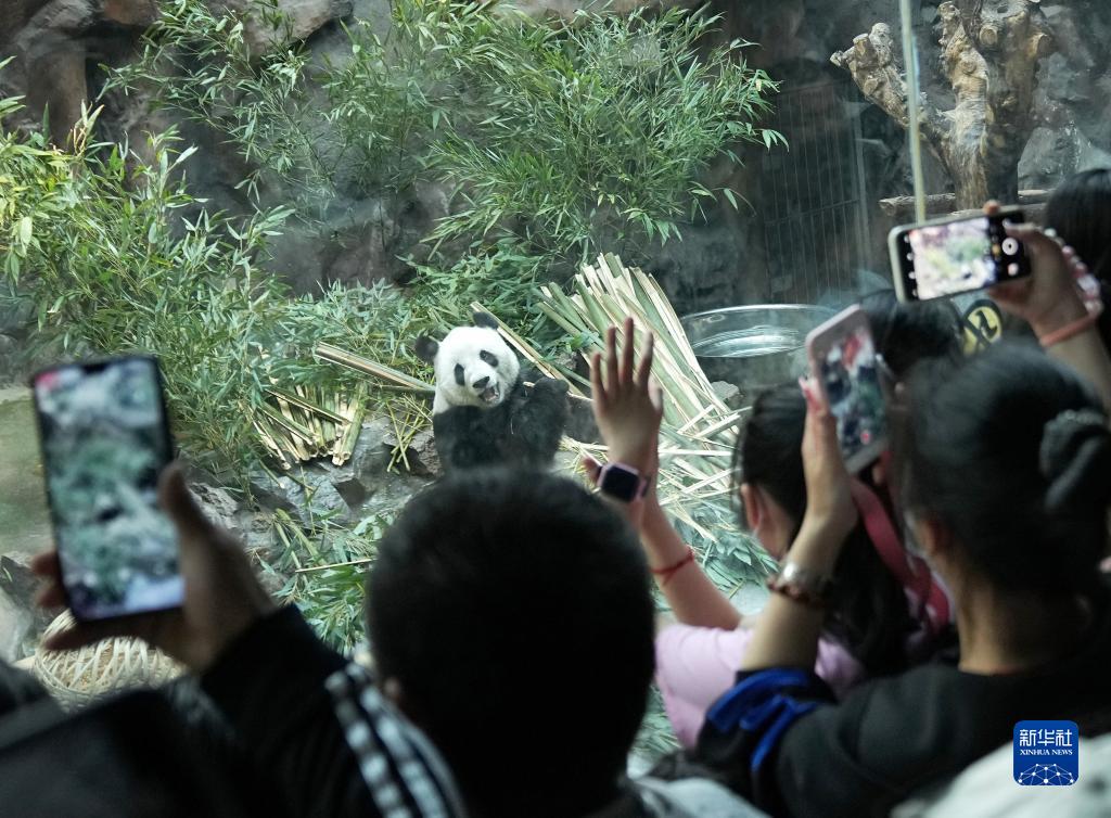 4月30日,游客在北京动物园大熊猫馆观赏大熊猫。