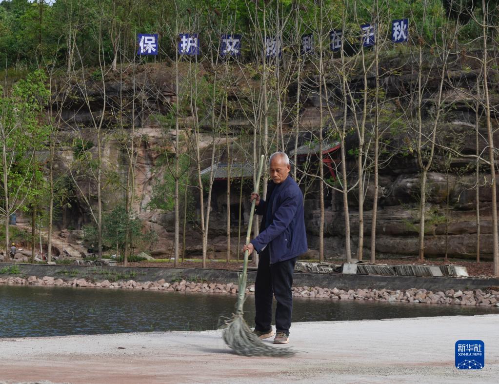 4月3日,吴忠富在卧佛院内打扫卫生。