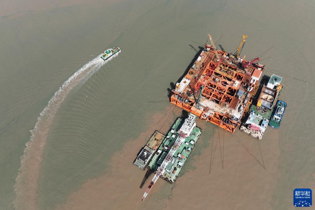 4月30日,在位于浙江省舟山市定海区册子岛海边的甬舟铁路西堠门公铁两用桥5、6号墩建设工地,中铁大桥局的工人进行施工(无人机照片)。