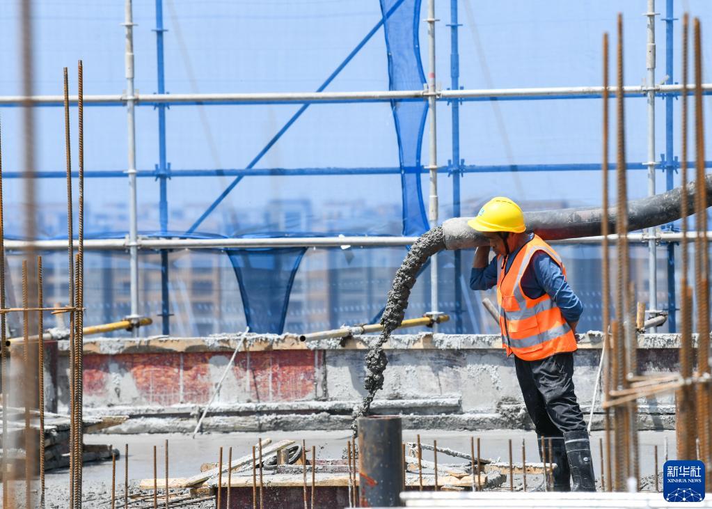 4月30日,中建三局的工人在成都芯谷产业功能区配套项目浇筑混凝土。