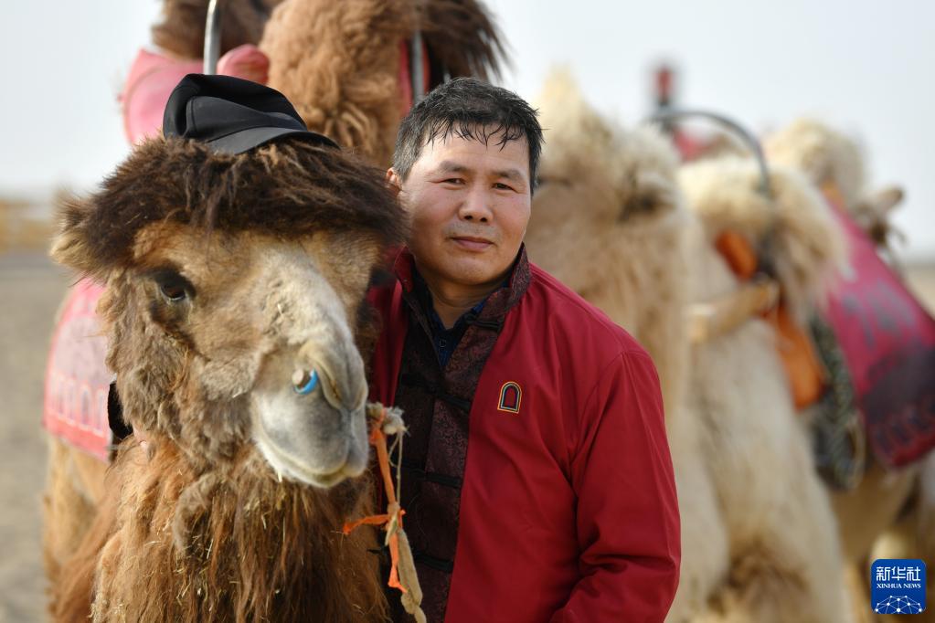 曹文华和编号“414”的领头骆驼合影(4月24日摄)。