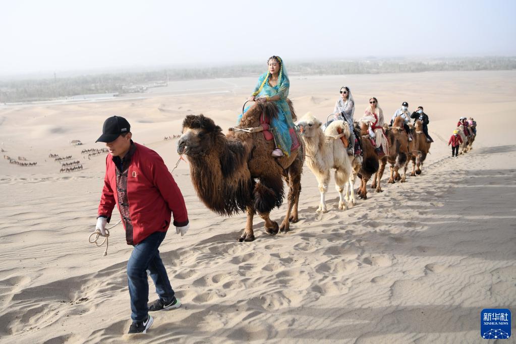 曹文华和他的驼队载着游客行走在鸣沙山月牙泉景区的驼道上(4月24日摄)。