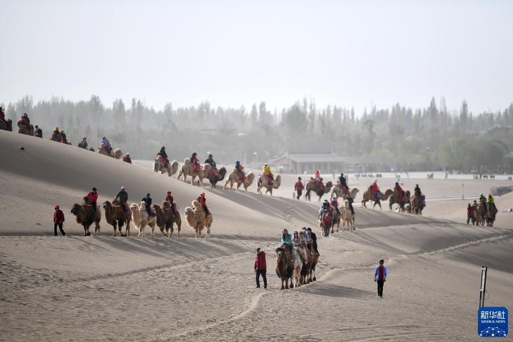 载着游客的驼队行走在鸣沙山月牙泉景区(4月24日摄)。