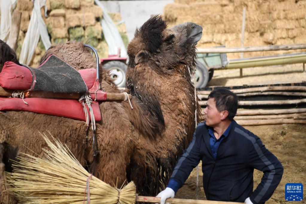曹文华在驼圈里打扫卫生,为骆驼“上班”做准备(4月24日摄)。