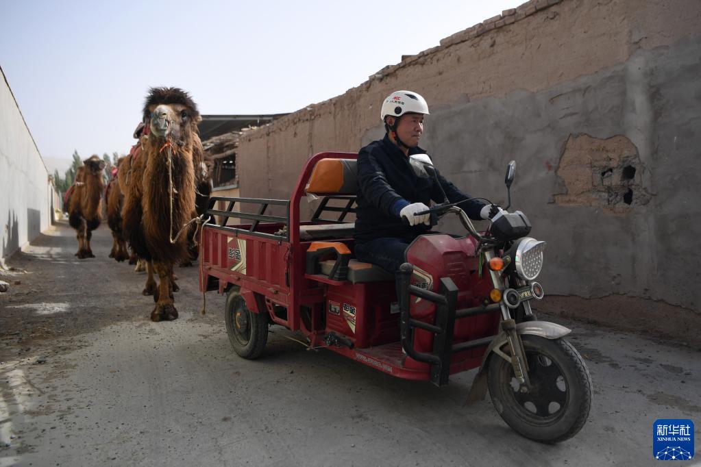 曹文华骑着三轮车牵骆驼前往鸣沙山月牙泉景区(4月24日摄)。
