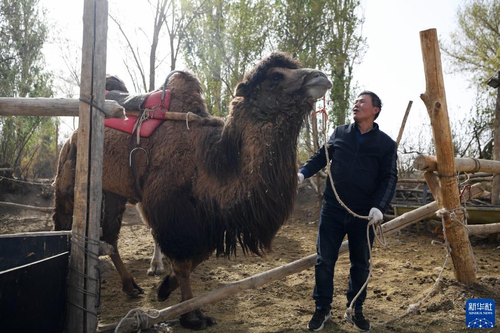 曹文华准备牵骆驼前往鸣沙山月牙泉景区(4月24日摄)。