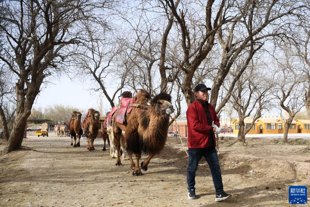 换上景区工作服的曹文华牵着骆驼准备“上班”(4月24日摄)。