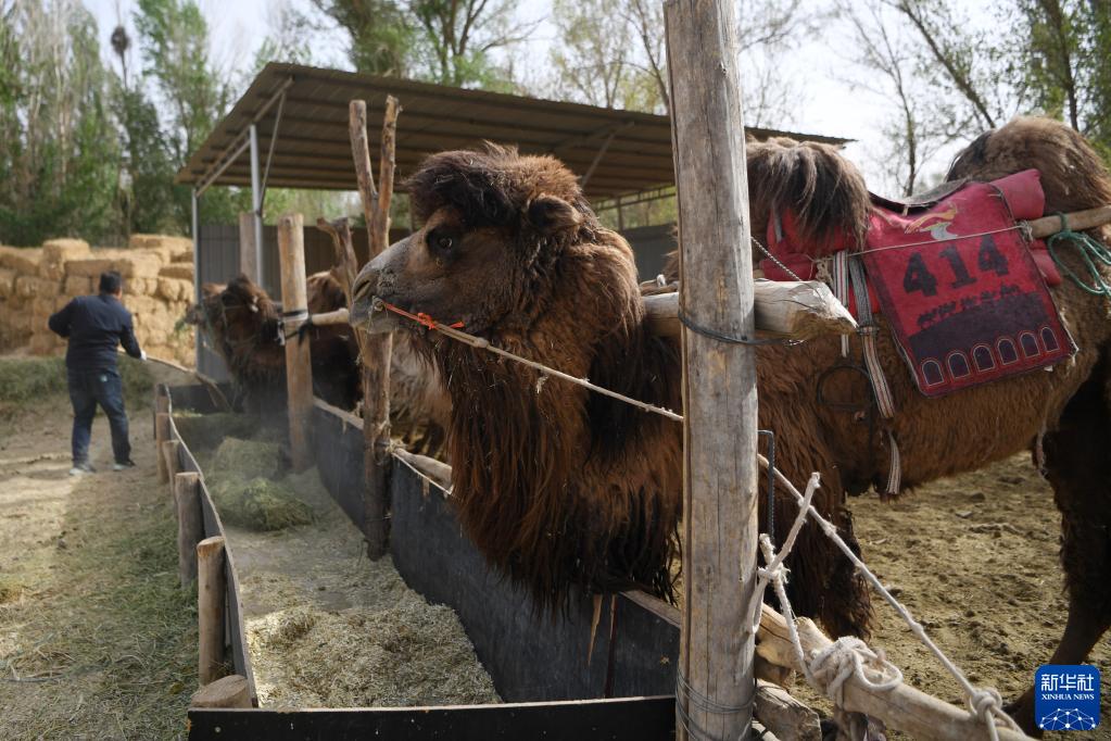 编号“414”的骆驼“上班”前在驼圈里吃草料(4月24日摄)。