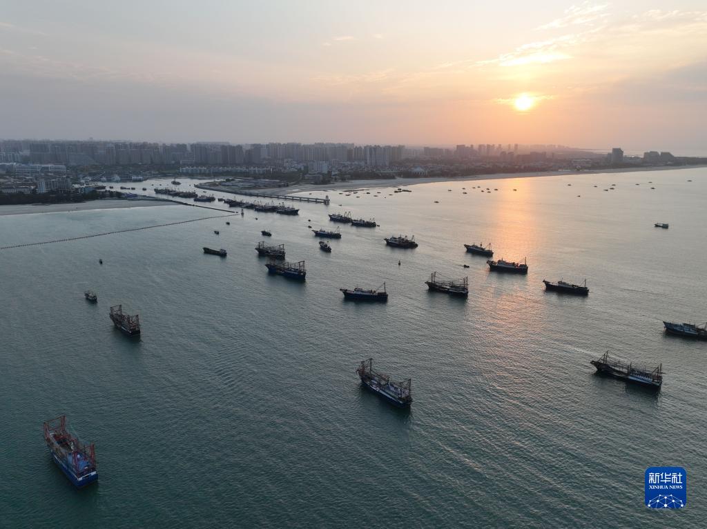 4月30日清晨,广西北海休渔船只有序驶回银海区电建渔港(无人机照片)。