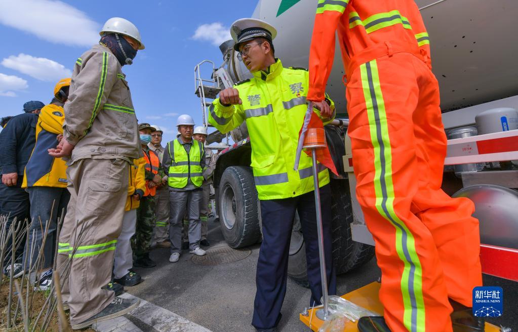 4月30日,乌鲁木齐市公安局交通警察支队宣传科民警李亮东(右)向活动参与者讲解交通安全知识。