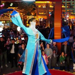 4月30日晚,游客在东平县的大宋不夜城观看表演。