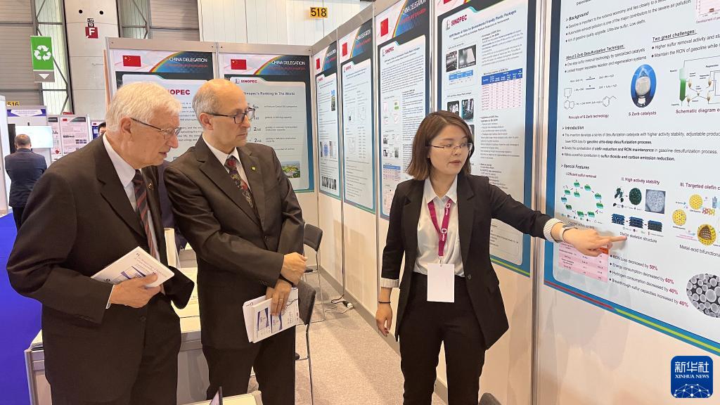 4月29日,在瑞士日内瓦举行的第48届日内瓦国际发明展上,金奖项目“S Zorb汽油吸附脱硫技术”发明团队代表宋烨(右一)向参观者介绍发明项目(手机照片)。