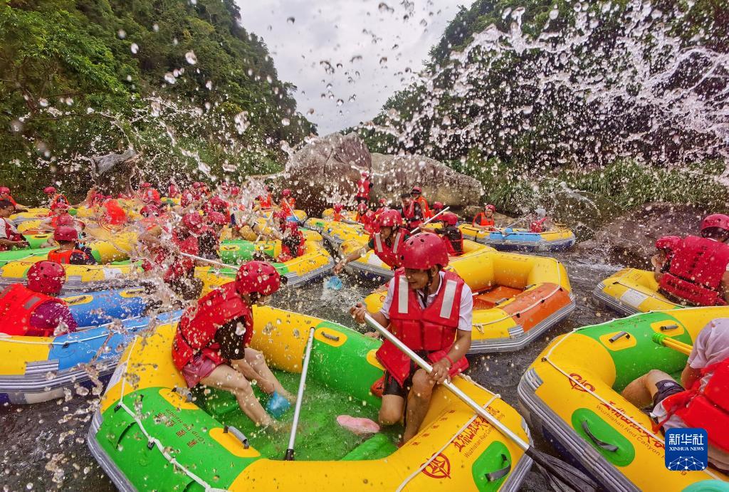 4月30日,游客在海南省五指山市体验红峡谷漂流。