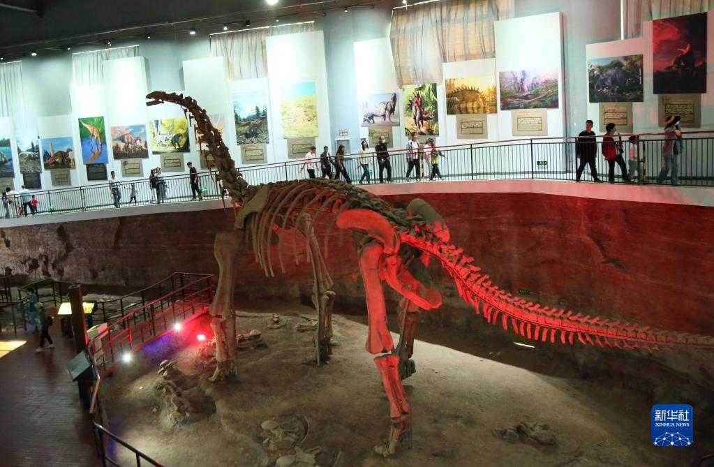 4月30日,游客在河南汝阳恐龙国家地质公园恐龙博物馆参观。