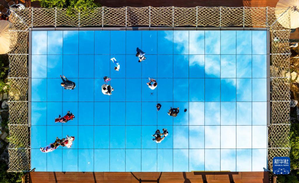 4月29日,游客在贵州省黔西市化屋露营基地“天空之镜”景点休闲游玩(无人机照片)。