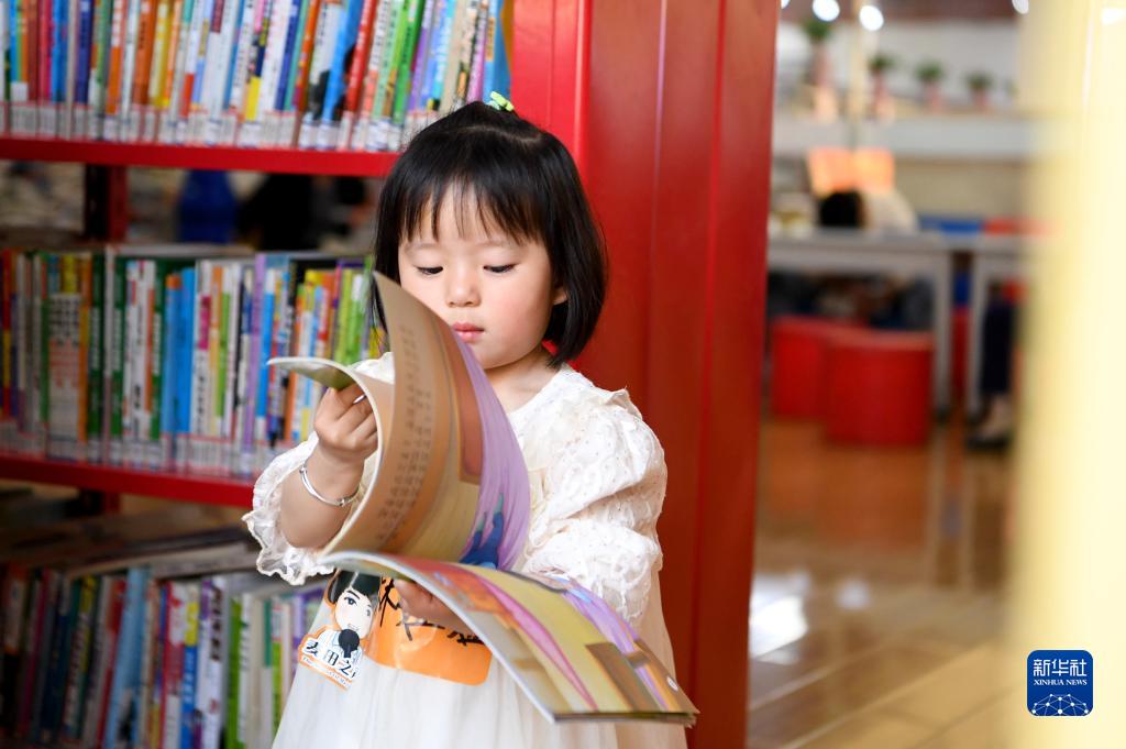 5月1日,小朋友在河南省平顶山市郏县图书馆翻阅书籍。