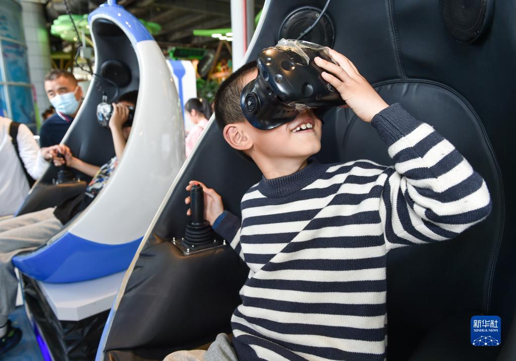 5月1日,小朋友在南京科技馆通过VR技术体验“海底两万里”。