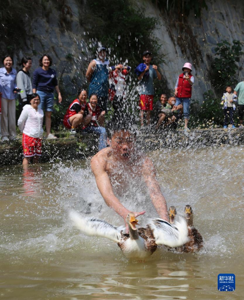 5月1日,村民在贵州省黔东南苗族侗族自治州雷山县大塘镇咱刀村体验捉鸭游戏。