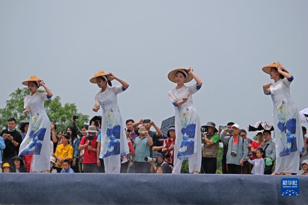 4月30日,游客在广西南宁园博园观看民族舞蹈表演。
