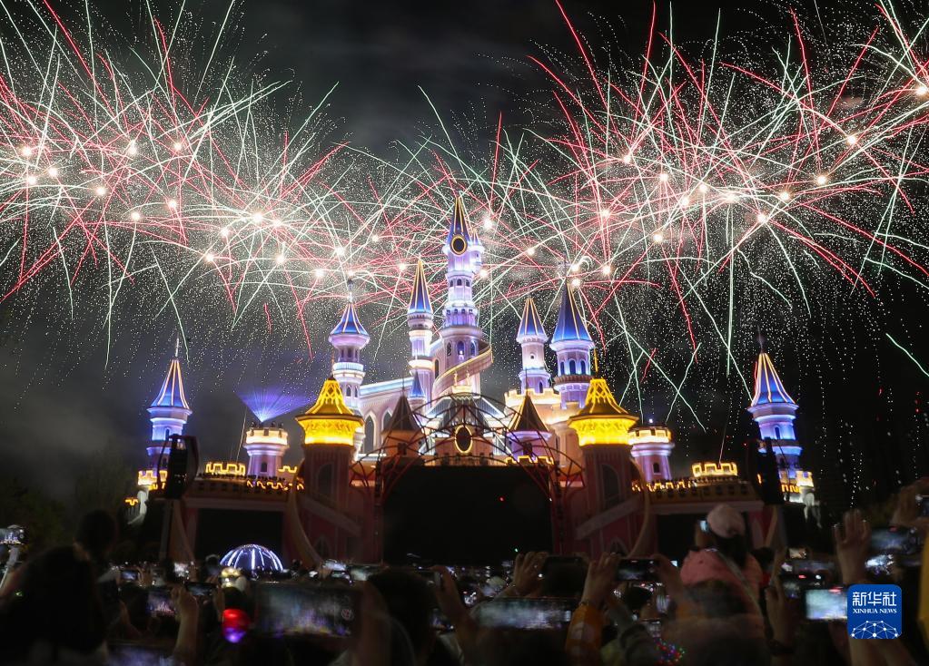 5月1日,游客在沈阳方特欢乐世界观赏烟花表演。