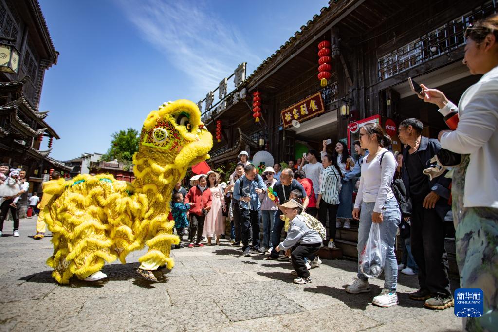 4月30日,游客在重庆市秀山土家族苗族自治县洪安古镇老街观看舞狮表演。