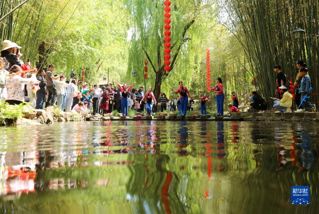 4月30日,游客在山东省临沂市沂南县铜井镇竹泉村观看民俗表演。