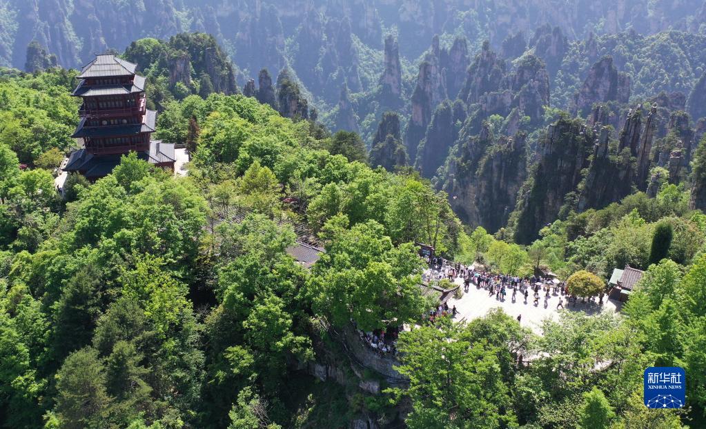 4月30日,游人在湖南张家界国家森林公园天子山游玩赏景(无人机照片)。