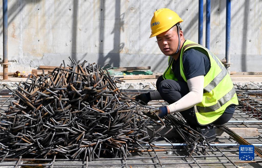 5月1日,工人在中建二局陕西分公司高铁新城项目工地施工。